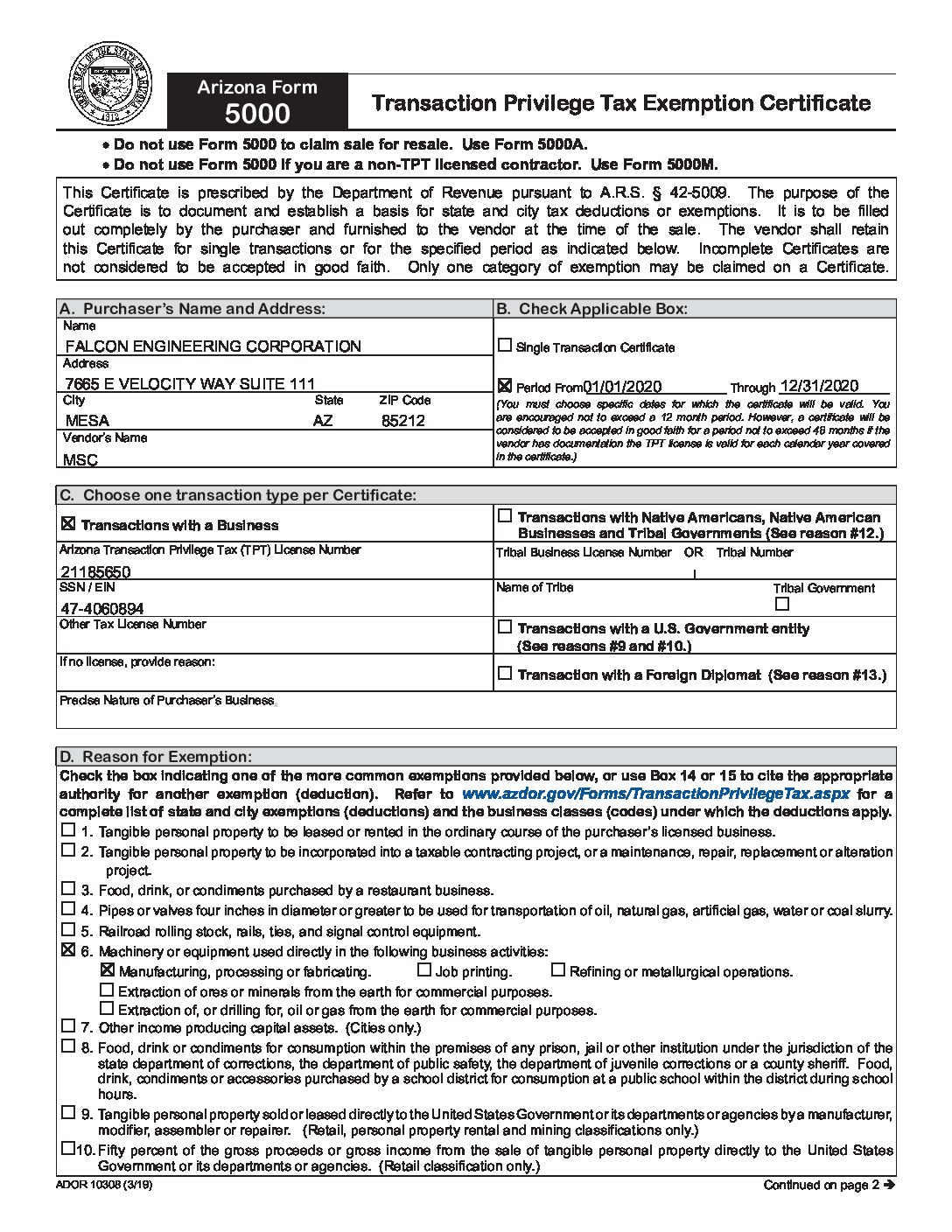 050420 Completed Form ST-105 - Indiana Sales Tax Exemption Certificate Signed...